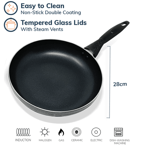 Non-stick die-cast aluminium with a durable double coating. Heat resistant handles, easy-clean coating and suitable for all types of hobs, including induction.