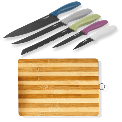 Set of five sharp kitchen knives and wooden chopping board. The knives have soft grip handles and a slick non-stick coating on the blade for easy cleaning.
